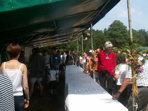 | La table a été joliment décorée et le stand est à l'enseigne du barricot. | Les verres sont en place avant d'être remplis. |