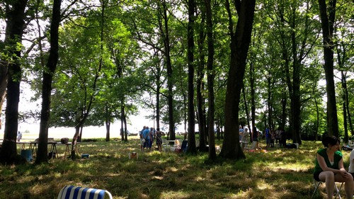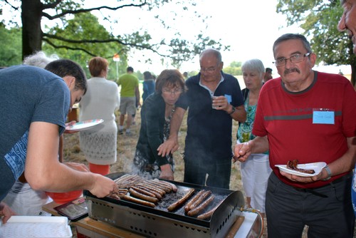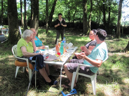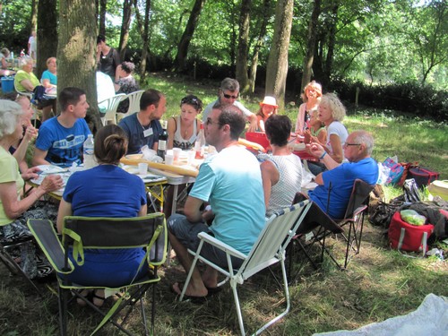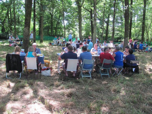 Après avoir partagé le verre de l'amitié, les cousines et cousins ont déployé la table, les chaises et la nappe pour un pique-nique en famille à l'ombre du bois : les meilleures conditions pour un agréable déjeuner. |
